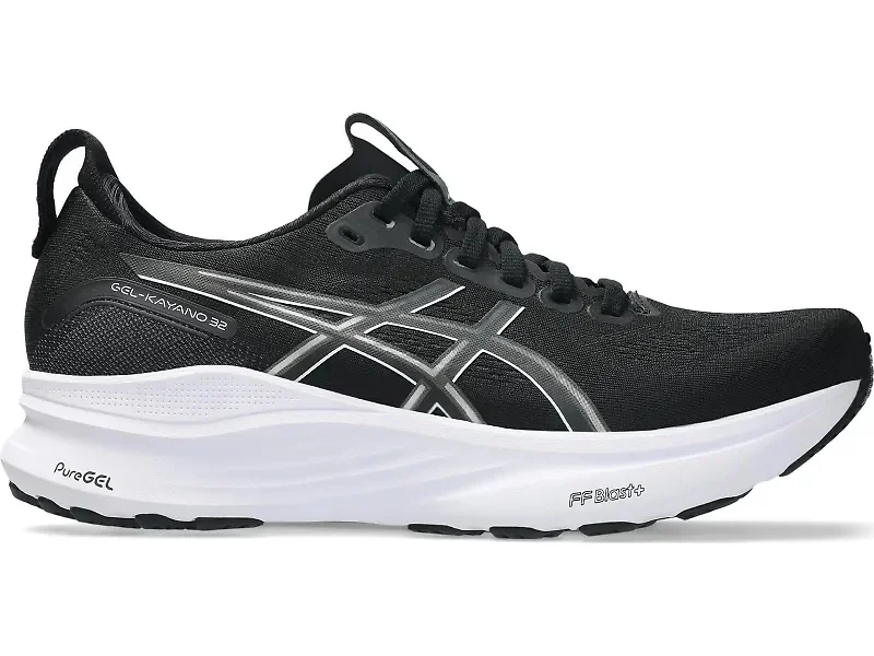 The ASICS GEL-Kayano 32 delivers smooth support and stability with every step. Built on ASICS' innovative 4D Guidance System, this shoe works with your natural movement to deliver structured support that feels smooth and natural. The thick stack of FF BLAST™ PLUS cushioning provides reliable comfort mile after mile, while the flared midsole gives you that ultra-stable platform you can count on through every step of your gait cycle. In our review of the ASICS GEL-Kayano 32, run tester Heather said, "The Kayano seemed to disappear on my foot while I enjoyed some easy Saturday morning miles with my husband, which is a great thing. It felt nice and natural, which is exactly the goal of the 4D Guidance system in the shoe." Details: - Upper: The engineered stretch knit material adapts to your foot shape while staying breathable on those long runs. ASICS' 3D Space Construction technology creates different compression patterns for men's and women's models, ensuring the perfect step-in comfort that recognizes we all have different needs. - Midsole: FF BLAST™ PLUS foam delivers structured cushioning that absorbs impact without feeling squishy or unstable. The 4D Guidance System includes resilient foam right under your arch for extra reinforcement and a touch of energy return, while the rounded heel bevel helps control impact as you land. A flared midsole extends beyond the upper to create a wider, more stable platform for confident landings and smooth toe-offs. - Outsole: The HYBRID ASICSGRIP™ outsole combines ASICSGRIP™ rubber and AHARPLUS™ materials to give you advanced grip and durability.