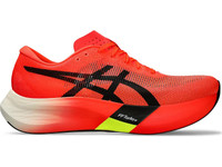 The carbon-plated ASICS MetaSpeed Edge Paris is built to crush your PRs. This is a shoe for cadence-style runners who change cadence easier as they run faster. (If you change your stride to run faster, then the ASICS MetaSeed Sky. was designed for you). The MetaSpeed Edge features ASICS’ FF BLAST TURBO™, a lightweight cushion that improves compression and creates a responsive feel underfoot. This is combined with a carbon plate to guide and propel your foot forward. The MetaSpeed Edge’s curved sole design helps to reduce ankle flexion, which allows runners to conserve more energy and run further. The ASICSGRIP™ outsole is grippy to handle twists and turns (as well as wet pavement) on race day. This shoe is stable, with a lower stack height and firmer cushion than other carbon-plated shoes, which makes it great for 5K to half marathons, particularly if they have a lot of twists and turns. The upper is light, breathable and a bit stiff, so you can get a good lockdown feel and run those corners with ease. This shoe fits a bit narrower and shorter than other ASICS shoes, so if you are in between sizes, you may want to get a half size larger. Start fast and finish faster in the ASICS MetaSpeed Edge Paris.