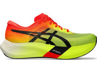 The carbon-plated ASICS MetaSpeed Edge Paris is built to crush your PRs. This is a shoe for cadence-style runners who change cadence easier as they run faster. (If you change your stride to run faster, then the ASICS MetaSeed Sky. was designed for you). The MetaSpeed Edge features ASICS’ FF BLAST TURBO™, a lightweight cushion that improves compression and creates a responsive feel underfoot. This is combined with a carbon plate to guide and propel your foot forward. The MetaSpeed Edge’s curved sole design helps to reduce ankle flexion, which allows runners to conserve more energy and run further. The ASICSGRIP™ outsole is grippy to handle twists and turns (as well as wet pavement) on race day. This shoe is stable, with a lower stack height and firmer cushion than other carbon-plated shoes, which makes it great for 5K to half marathons, particularly if they have a lot of twists and turns. The upper is light, breathable and a bit stiff, so you can get a good lockdown feel and run those corners with ease. This shoe fits a bit narrower and shorter than other ASICS shoes, so if you are in between sizes, you may want to get a half size larger. Start fast and finish faster in the ASICS MetaSpeed Edge Paris.