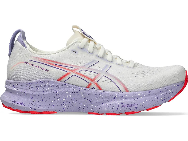 The ASICS GEL-Kayano 32 delivers smooth support and stability with every step. Built on ASICS' innovative 4D Guidance System, this shoe works with your natural movement to deliver structured support that feels smooth and natural. The thick stack of FF BLAST™ PLUS cushioning provides reliable comfort mile after mile, while the flared midsole gives you that ultra-stable platform you can count on through every step of your gait cycle. In our review of the ASICS GEL-Kayano 32, run tester Heather said, "The Kayano seemed to disappear on my foot while I enjoyed some easy Saturday morning miles with my husband, which is a great thing. It felt nice and natural, which is exactly the goal of the 4D Guidance system in the shoe." Details: - Upper: The engineered stretch knit material adapts to your foot shape while staying breathable on those long runs. ASICS' 3D Space Construction technology creates different compression patterns for men's and women's models, ensuring the perfect step-in comfort that recognizes we all have different needs. - Midsole: FF BLAST™ PLUS foam delivers structured cushioning that absorbs impact without feeling squishy or unstable. The 4D Guidance System includes resilient foam right under your arch for extra reinforcement and a touch of energy return, while the rounded heel bevel helps control impact as you land. A flared midsole extends beyond the upper to create a wider, more stable platform for confident landings and smooth toe-offs. - Outsole: The HYBRID ASICSGRIP™ outsole combines ASICSGRIP™ rubber and AHARPLUS™ materials to give you advanced grip and durability.