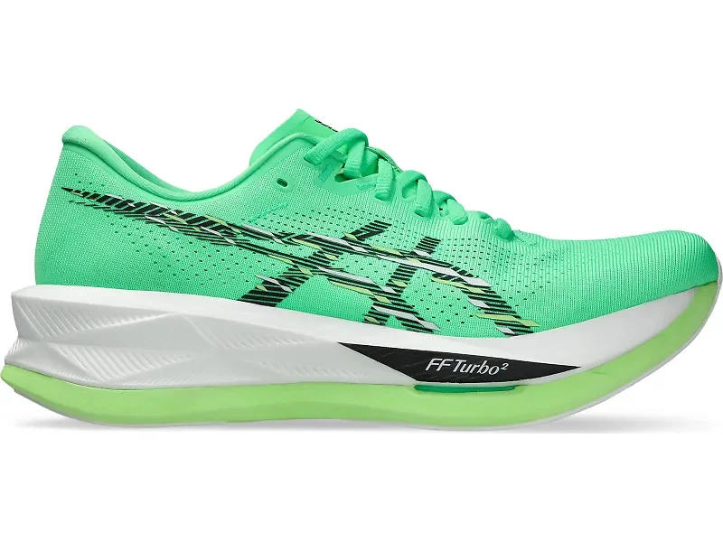 Speed feels natural in the ASICS Sonicblast. Ready to graduate from everyday training shoes to something snappier? The Sonicblast combines the familiar comfort of FF BLAST MAX cushioning with ultra-bouncy FF Turbo² foam and a flexible Pebax Astroplate to create a springy ride that thrives at faster paces. In our ASICS Sonicblast review, wear-tester Heather said "The FF Turbo² foam felt light and responsive, and it's just an exciting shoe to run in." Details: - Upper: The jacquard woven construction delivers that "just right" Goldilocks fit—not too loose, not too tight, but perfectly dialed in. The traditional feel includes a thin, stretchy tongue and slightly padded heel collar that disappears on your foot once you start moving, letting you focus entirely on your run. - Midsole: The innovative dual-layer design places FF BLAST MAX on the bottom for stability and familiar comfort, topped with FF Turbo² foam for that wild energy return. The teardrop-shaped Pebax Astroplate flexes naturally between the layers, creating an experience that's firm and engaging without feeling harsh or unforgiving. - Outsole: ASICSGRIP technology gives you the confidence to tackle any surface, so you can focus on enjoying your run instead of worrying about your footing.