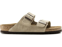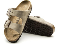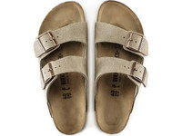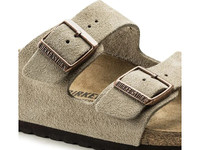Slip into comfort with the iconic Birkenstock Arizona Suede Sandal. The Arizona is the iconic two-strap design from Birkenstock with the signature comfort of their contoured footbed. All Birkenstock footbeds start with a deep heel cup that cradles your heel and your natural cushioning right under the heel bone. To maintain proper alignment and support your tired feet, transverse arch support runs through the middle of the footbed. A roomy forefoot lets your toes move more naturally while a raised toe bar encourages the natural gripping motion of your feet and stimulates circulation. The straps of the Arizona Sandals are made with suede. The suede is a split leather with a napped finish. It has a velvety surface and is very soft to the touch. It also boasts a high moisture absorption capacity, so these are perfect for the beach or pool—just be sure to dry them out if they get soaked. When you want to indulge your feet after a long run or need a pair of sandals to take the dog out, Birkenstock Arizona Suede Sandals are comfortable and have a classic style.