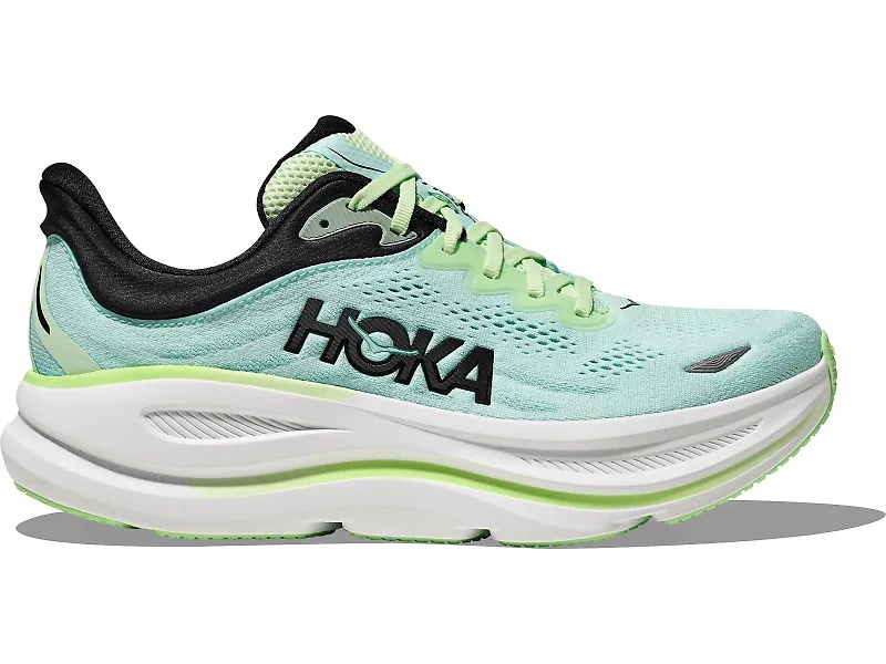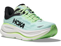The HOKA Bondi 9 is designed to eat up the bulk of your everyday miles with peak plushness. With an extra 2 mm of soft yet responsive, super critical EVA foam and a rolling sensation that propels you forward with less effort, the Bondi 9 delivers the cushion and comfort you crave for long runs, long walks and long hours spent on your feet. So whether you’re taking your runs to new distances or simply seeking all-day comfort, the Bondi 9’s ultra-cushioned ride and snug, accommodating fit will turn the pavement into clouds. Details: - Upper: A knit upper paired with a retooled 3D molded heel collar offers a more accommodating fit. The extended heel pull makes slipping in and out of the shoe easy while reflective details increase visibility for extra safety during early morning or evening runs. - Midsole: This max-cushioned midsole features super critical EVA foam for a softer, more responsive ride. The smooth Meta-Rocker™ geometry is designed for effortless transitions while the rearfoot-focused Active Foot Frame™ cradles your heel for better stability and balance. Plus, an additional 2 mm of cushioning boosts comfort and support underfoot. - Outsole: A Durabrasion rubber outsole uses strategically placed zones to provide durability and reliable traction without weighing you down.