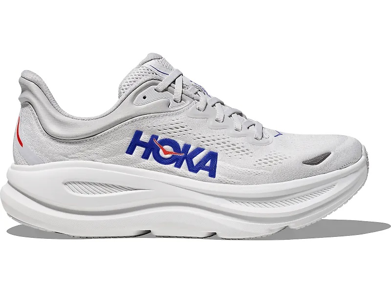 The HOKA Bondi 9 is designed to eat up the bulk of your everyday miles with peak plushness. With an extra 2 mm of soft yet responsive, super critical EVA foam and a rolling sensation that propels you forward with less effort, the Bondi 9 delivers the cushion and comfort you crave for long runs, long walks and long hours spent on your feet. So whether you’re taking your runs to new distances or simply seeking all-day comfort, the Bondi 9’s ultra-cushioned ride and snug, accommodating fit will turn the pavement into clouds. Details: - Upper: A knit upper paired with a retooled 3D molded heel collar offers a more accommodating fit. The extended heel pull makes slipping in and out of the shoe easy while reflective details increase visibility for extra safety during early morning or evening runs. - Midsole: This max-cushioned midsole features super critical EVA foam for a softer, more responsive ride. The smooth Meta-Rocker™ geometry is designed for effortless transitions while the rearfoot-focused Active Foot Frame™ cradles your heel for better stability and balance. Plus, an additional 2 mm of cushioning boosts comfort and support underfoot. - Outsole: A Durabrasion rubber outsole uses strategically placed zones to provide durability and reliable traction without weighing you down.