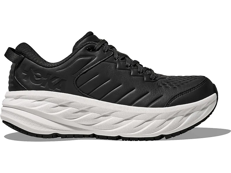 The men's HOKA Bondi SR brings the super-plush cushioning of the classic Bondi to a shoe that’s fit for the workplace. HOKA built the Bondi SR with a water-resistant leather upper that’s comfortable and flexible. Plus, the clean look and single color choice makes the Bondi SR suitable for work. Underfoot, designers made two decisions that make the Bondi SR a stellar shoe for anyone who works all day on their feet: a huge cushion and slip-resistance. The Bondi is the most-cushioned shoe in HOKA’s lineup, so it will be comfortable for a full shift (or more), and the outsole is made with a slip-resistant rubber and tread design that’s tested on surfaces with water, oil and soap. With the leather upper, ultra-soft cushioning and non-marking outsole, the men's HOKA Bondi SR is perfect for anyone who works in a restaurant, a hospital or anywhere else that requires long shifts on your feet.