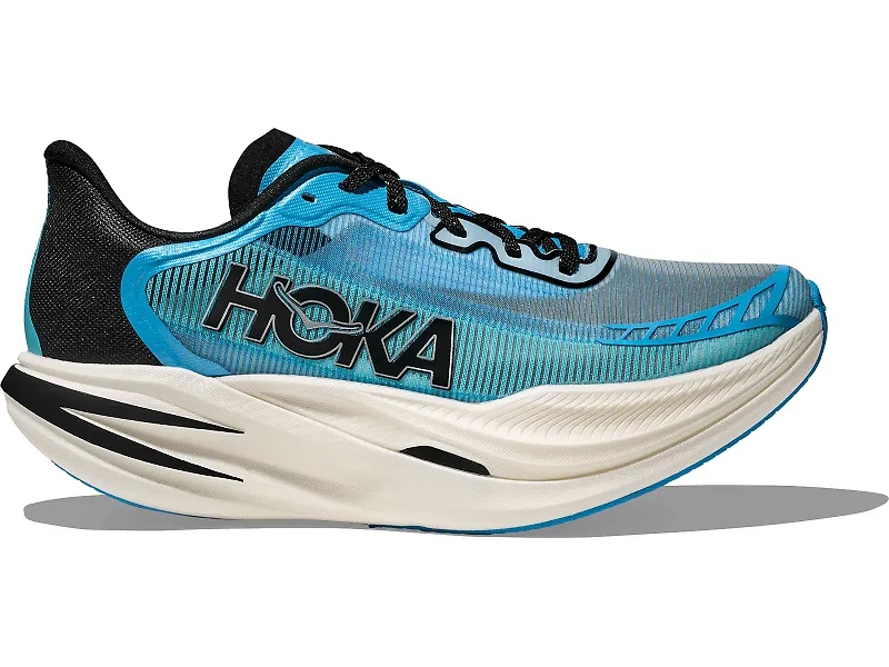 The HOKA Cielo X1 2.0 is designed for pure racing speed. Engineered with a winged carbon plate and dual-layer PEBA foam, this lightweight racer delivers a downright exhilarating ride for your fastest efforts. The aggressive Meta-Rocker and enhanced forefoot cushioning create lightning-quick transitions while the improved outsole grip keeps you confident at top speeds. Details: - Upper: Light, breathable engineered jacquard mesh with warp knit tongue and 3D screen printed overlays give you a secure race-day fit. - Midsole: Dual-layer PEBA foam with winged carbon plate and lateral cutouts. Active FootFrame provides forefoot-focused stability. - Outsole: Enhanced sticky rubber placement improves traction while maintaining race weight.