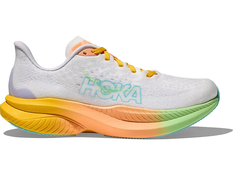 It feels good to run fast in the HOKA Mach 6. Have your runs felt stagnant lately? Not anymore. These lightweight trainers are your key to unlocking everyday speed. The new super critical foam is fine-tuned for extra energy return, giving you the perfect amount of snappy responsiveness and bouncy cushioning to push the pace and keep your legs feeling fresh. “I tested the Mach 6 on an 8-mile run with 30-second pickups every mile. I noticed that it felt peppier and better for up-tempo runs than the Mach 5,” says Kate, who’s currently training for a half-marathon. “I was able to get a good turnover going, and picking up the pace every mile felt smooth.” Read more from our HOKA Mach 6 review. Details: - Upper: The lightweight and breathable creel jacquard mesh upper feels like air conditioning for your feet while extra padding along the heel collar and a gusseted tongue give you a performance fit with foot-hugging comfort to go the distance. - Midsole: The new super critical EVA foam midsole is composed of multiple tiny cells (imagine running on millions of small air bubbles), which offer more responsiveness at a lighter weight than traditional midsole compounds. The result is a firm yet peppy ride. - Outsole: Strategic rubber coverage on the outsole gives you confident footing while you’re turning corners and running at top speed.