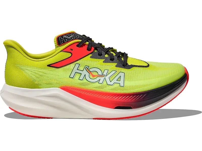 [Outfitter's Tip: The HOKA Rocket X 3 is a unisex-sized shoe. Men's sizes are shown; women should order 1.5 sizes below their standard running shoe size. For example: for a women's size 9.5 shoe, order a size 8.] Prepare for blastoff in the HOKA Rocket X 3. Built to bridge the gap between training and racing, the Rocket X 3 delivers energetic performance without sacrificing the comfort and stability you need to stay confident at speed. This entry-level supershoe combines dual-density PEBA foam with a winged carbon-fiber plate and HOKA's signature rocker geometry to propel you toward your personal best. In our HOKA Rocket X 3 review, run tester Caroline said "The step-in feel was everything I'd want in a super shoe. It really comes to life while running and feels quite stable even over uneven pavement." Details: - Upper: The single-layer warp-knit construction gives you stretchy support with excellent breathability. A soft, padded heel collar prevents blisters during long efforts, while textured laces ensure secure lockdown when the pace picks up. - Midsole: Dual-density PEBA foam creates the perfect balance of soft comfort underfoot with firm responsiveness. The full-length carbon-fiber plate features innovative winglets that cradle your midfoot for added stability and smooth energy return. - Outsole: New sticky rubber compound delivers reliable traction on varied surfaces, from smooth asphalt to morning-dew-covered bridges.