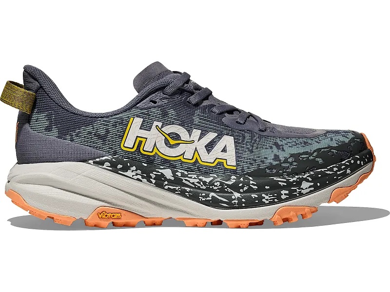 Blaze new trails and conquer gnarly terrain in the HOKA Speedgoat 6. The refined Speedgoat 6 builds on its legend with a responsive, lightweight CMEVA midsole that serves up a buttery smooth, high-rebounding ride to keep you feeling fresh over long efforts. But, what really sets the Speedgoat apart is its ultra-grippy Vibram® Megagrip outsole with aggressive Traction Lugs inspired by an actual goat's hoof. So whether you're chasing FKTs on technical singletrack or just getting after it on your local trails, the HOKA Speedgoat 6 delivers incredible grip and HOKA's cloud-like cushioning in an ultralight, ultra-capable trail shoe. Details: - Upper: A dynamic sandwich mesh upper keeps your feet cool and protected, while a gusseted tongue with plush padding helps you stay comfortable over the long haul. - Midsole: All-new, lightweight and resilient CMEVA foam gives you tried-and-true cushioning for all-day trail runs, while the late-stage meta-rocker shape helps roll you through your gait. - Outsole: The Vibram® Megagrip outsole with 5 mm Traction Lugs claws into loose dirt, mud and technical terrain so you can charge uphills and bomb downhills with confidence.