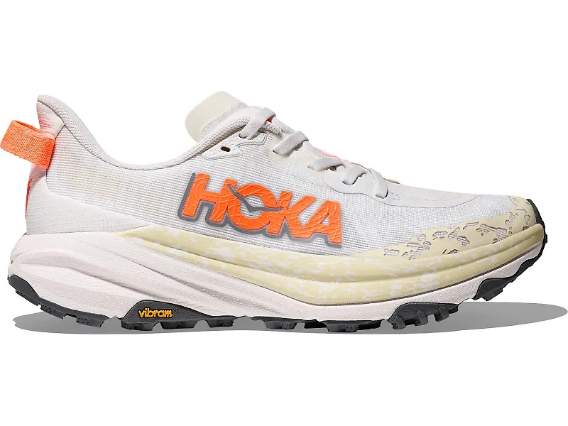 Blaze new trails and conquer gnarly terrain in the HOKA Speedgoat 6. The refined Speedgoat 6 builds on its legend with a responsive, lightweight CMEVA midsole that serves up a buttery smooth, high-rebounding ride to keep you feeling fresh over long efforts. But, what really sets the Speedgoat apart is its ultra-grippy Vibram® Megagrip outsole with aggressive Traction Lugs inspired by an actual goat's hoof. So whether you're chasing FKTs on technical singletrack or just getting after it on your local trails, the HOKA Speedgoat 6 delivers incredible grip and HOKA's cloud-like cushioning in an ultralight, ultra-capable trail shoe. Details: - Upper: A dynamic sandwich mesh upper keeps your feet cool and protected, while a gusseted tongue with plush padding helps you stay comfortable over the long haul. - Midsole: All-new, lightweight and resilient CMEVA foam gives you tried-and-true cushioning for all-day trail runs, while the late-stage meta-rocker shape helps roll you through your gait. - Outsole: The Vibram® Megagrip outsole with 5 mm Traction Lugs claws into loose dirt, mud and technical terrain so you can charge uphills and bomb downhills with confidence.