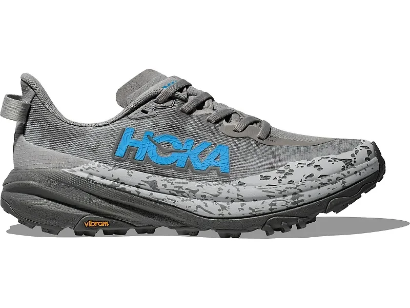 Blaze new trails and conquer gnarly terrain in the HOKA Speedgoat 6. The refined Speedgoat 6 builds on its legend with a responsive, lightweight CMEVA midsole that serves up a buttery smooth, high-rebounding ride to keep you feeling fresh over long efforts. But, what really sets the Speedgoat apart is its ultra-grippy Vibram® Megagrip outsole with aggressive Traction Lugs inspired by an actual goat's hoof. So whether you're chasing FKTs on technical singletrack or just getting after it on your local trails, the HOKA Speedgoat 6 delivers incredible grip and HOKA's cloud-like cushioning in an ultralight, ultra-capable trail shoe. Details: - Upper: A dynamic sandwich mesh upper keeps your feet cool and protected, while a gusseted tongue with plush padding helps you stay comfortable over the long haul. - Midsole: All-new, lightweight and resilient CMEVA foam gives you tried-and-true cushioning for all-day trail runs, while the late-stage meta-rocker shape helps roll you through your gait. - Outsole: The Vibram® Megagrip outsole with 5 mm Traction Lugs claws into loose dirt, mud and technical terrain so you can charge uphills and bomb downhills with confidence.