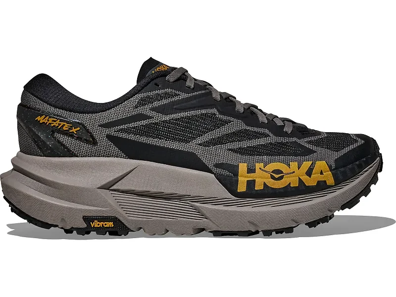 Calling all trail racing fiends, gravel grinders and 100-milers. There’s a new trail titan in town. Built for long-haul efforts, the Mafate X delivers supreme plushness with a dual-density, premium foam chassis, PEBA top layer and a pop of propulsion thanks to a forked carbon fiber plate. HOKA implemented an ultralight woven upper that allows for easy drainage and Vibram® Megagrip outsole with pod-like cutouts to ensure a smooth ride over variable terrain. Details: - Upper: The thoughtfully designed woven textile upper with patent-pending dynamic vamp adapts to your foot shape while letting water escape after stream crossings. The gusseted tongue keeps debris out, while the protective toe cap and molded TPU heel counter keep you secure when the trail gets rough. - Midsole: HOKA smooth MetaRocker™ works with the rearfoot-focused Active Foot Frame™ to guide your stride naturally. The carbon fiber plate delivers energy that helps you power through fatigue, while the PEBA core and super critically foamed EVA carrier provide cushioning that stays comfortable for miles upon miles. - Outsole: Trust your footing thanks to the Vibram® Megagrip compound with 3.5 mm lugs and zonal rubber placement that balances grip, durability and weight.