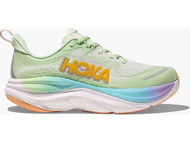 Take your everyday miles to the next level in the HOKA Skyflow. The Skyflow’s smooth geometry is inspired by the Skyward X and uses an upgraded foam compound to give you a springy ride that will keep you comfortable for miles. A supportive heel-focused Active Foot Frame cradles your foot while the early-stage MetaRocker gives you an effortless stride. Details: - Upper: The upper features a breathable creel jacquard mesh that gives you a secure yet comfortable fit that adapts to your foot. A dual-gusseted tongue and sleek collar construction ensures a great lockdown for every run. - Midsole: The cushy midsole boasts supercritical EVA foam for a plush, responsive ride that balances cushioning and energy return for daily miles. Plus, the forefoot rocker profile provides snappy transitions and enhanced ground contact for a smoother ride. - Outsole: Durable high-abrasion rubber is engineered for long-lasting traction and durability, even on high-mileage runs.