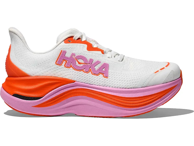 Miles feel effortless in the HOKA Skyward X. This supremely cushioned trainer takes soft and smooth to the extreme. It features HOKA's groundbreaking suspension system with a convex carbon fiber plate that compresses and springs back with every stride. A highly resilient PEBA foam sits closest to your foot for lively, cloud-like cushioning, while a super critical EVA frame provides a stable base below. In our full review of the HOKA Skyward X, run tester Mandy said, “I felt as if I was rolling through my runs and could run forever. This included both weekend long runs and shorter after-work runs. I liked running hillier sections in these shoes more than flatter sections because the combination of the carbon plate, cushioning and rocker shape allowed me to really let ‘er rip when going downhill.” Details: - Upper: A flat knit upper with zonal engineering molds to your foot for a sock-like fit. Perforated material increases breathability while plush padding on the tongue and heel collar gives you a premium feel. A tapered heel collar reduces chafing and irritation on your Achilles, and extra eyelets allow you to tie the marathon loop to lock down the fit. - Midsole: The Skyward X's midsole has three layers that work together to provide a comfortable and efficient ride. The first layer, closest to your foot, is made of PEBA foam, which gives a bit of cushioned bounce with each step. Beneath that is a curved carbon-fiber plate that compresses when your foot strikes the ground, storing energy to spring back and propel you forward as you push off. Finally, the bottom layer is an EVA foam that works with HOKA's signature rocker shape to create a smooth and effortless transition from heel to toe as you walk or run.