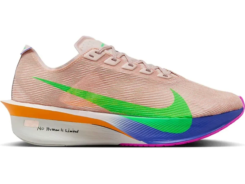 Get ready to fly past the competition in the Nike Vaporfly 4. These race-day rockets have been meticulously refined to create Nike's most efficient speed machine yet. From the mile to the marathon, you'll experience unprecedented lightness and responsiveness with every stride. By trimming weight throughout while maintaining the technology that matters most, the Vaporfly 4 delivers the perfect balance of featherweight construction and powerful propulsion that racers will love. Details: - Upper: The redesigned engineered mesh upper significantly reduces weight while providing a more consistent, secure fit throughout your race. A streamlined heel counter and minimalist tongue shed unnecessary grams without compromising comfort, keeping you focused solely on your performance when it counts most. - Midsole: The full-length carbon fiber Flyplate features a higher angle than its predecessor, working with the reduced 6 mm drop to create an incredibly propulsive feel. The lighter ZoomX foam runs from heel to toe, unlocking even more energy return with each stride, while the specially designed heel bulge enhances stability when you're pushing your limits. - Outsole: Thin rubber strategically placed on the outsole further reduces weight without sacrificing the durability or traction you need for race day performance.