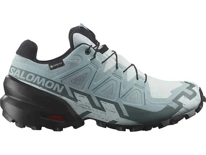 When you are looking for a running shoe to tackle tough, wet and muddy trails, look no further than the Salomon Speedcross 6 GTX. This legendary trail shoe stays true to its roots, yet somehow has even more grip and traction than ever. It features a Mud Contragrip® outsole that helps keep you upright on loose, soft, rugged or uneven surfaces. Plus, a GORE-TEX upper keeps your feet dry and comfortable when the trails get nasty. Details: - Upper: A revamped upper features Sensifit™construction for a precise, optimal foothold and a comfortable fit. The ripstop fabric is durable and keeps debris out, while also being lightweight and breathable. Salomon’s Quicklace™system gives you strong laces that tighten with one pull for easy-on, easy-off and prevent loose shoe strings from tripping you up. To top things off, a GORE-TEX membrane keeps the elements out for a dry and comfortable run. - Midsole: The EnergyCell™+ midsole foam gives you plenty of energy and rebound along with substantial cushioning and durability to go the distance. - Outsole: A knobby, Mud Contragrip® rubber outsole with 5 mm lugs gives you a grippy connection to the ground and faster mud evacuation.