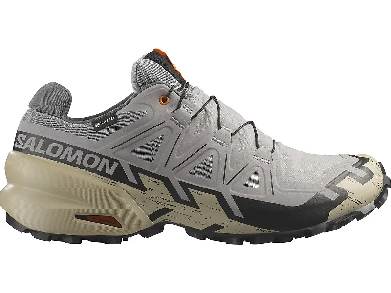 When you are looking for a running shoe to tackle tough, wet and muddy trails, look no further than the Salomon Speedcross 6 GTX. This legendary trail shoe stays true to its roots, yet somehow has even more grip and traction than ever. It features a Mud Contragrip® outsole that helps keep you upright on loose, soft, rugged or uneven surfaces. Plus, a GORE-TEX upper keeps your feet dry and comfortable when the trails get nasty. Details: - Upper: A revamped upper features Sensifit™construction for a precise, optimal foothold and a comfortable fit. The ripstop fabric is durable and keeps debris out, while also being lightweight and breathable. Salomon’s Quicklace™system gives you strong laces that tighten with one pull for easy-on, easy-off and prevent loose shoe strings from tripping you up. To top things off, a GORE-TEX membrane keeps the elements out for a dry and comfortable run. - Midsole: The EnergyCell™+ midsole foam gives you plenty of energy and rebound along with substantial cushioning and durability to go the distance. - Outsole: A knobby, Mud Contragrip® rubber outsole with 5 mm lugs gives you a grippy connection to the ground and faster mud evacuation.