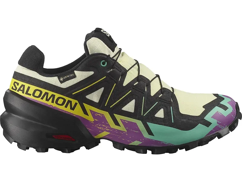 When you are looking for a running shoe to tackle tough, wet and muddy trails, look no further than the Salomon Speedcross 6 GTX. This legendary trail shoe stays true to its roots, yet somehow has even more grip and traction than ever. It features a Mud Contragrip® outsole that helps keep you upright on loose, soft, rugged or uneven surfaces. Plus, a GORE-TEX upper keeps your feet dry and comfortable when the trails get nasty. Details: - Upper: A revamped upper features Sensifit™construction for a precise, optimal foothold and a comfortable fit. The ripstop fabric is durable and keeps debris out, while also being lightweight and breathable. Salomon’s Quicklace™system gives you strong laces that tighten with one pull for easy-on, easy-off and prevent loose shoe strings from tripping you up. To top things off, a GORE-TEX membrane keeps the elements out for a dry and comfortable run. - Midsole: The EnergyCell™+ midsole foam gives you plenty of energy and rebound along with substantial cushioning and durability to go the distance. - Outsole: A knobby, Mud Contragrip® rubber outsole with 5 mm lugs gives you a grippy connection to the ground and faster mud evacuation.