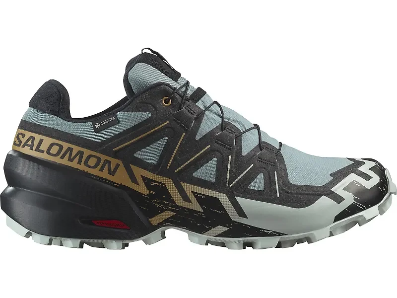When you are looking for a running shoe to tackle tough, wet and muddy trails, look no further than the Salomon Speedcross 6 GTX. This legendary trail shoe stays true to its roots, yet somehow has even more grip and traction than ever. It features a Mud Contragrip® outsole that helps keep you upright on loose, soft, rugged or uneven surfaces. Plus, a GORE-TEX upper keeps your feet dry and comfortable when the trails get nasty. Details: - Upper: A revamped upper features Sensifit™construction for a precise, optimal foothold and a comfortable fit. The ripstop fabric is durable and keeps debris out, while also being lightweight and breathable. Salomon’s Quicklace™system gives you strong laces that tighten with one pull for easy-on, easy-off and prevent loose shoe strings from tripping you up. To top things off, a GORE-TEX membrane keeps the elements out for a dry and comfortable run. - Midsole: The EnergyCell™+ midsole foam gives you plenty of energy and rebound along with substantial cushioning and durability to go the distance. - Outsole: A knobby, Mud Contragrip® rubber outsole with 5 mm lugs gives you a grippy connection to the ground and faster mud evacuation.