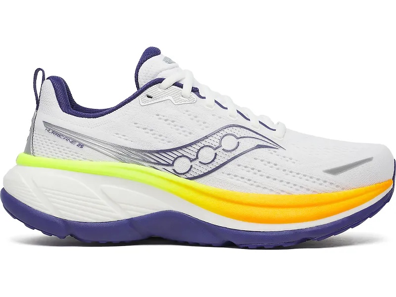 Experience smooth support that feels like floating in the Saucony Hurricane 25. Built for runners who want the perfect balance of cushioning and stability, the Hurricane 25 creates a supportive cradle for your feet without sacrificing the plush comfort you crave. Saucony's innovative dual-density midsole combines their durable PWRRUN foam with ultra-responsive PWRRUN PB cushioning, while Center Path Technology guides every step with confidence. In our Saucony Hurricane 25 review, run tester Kate said "The Hurricane balances support and softness while keeping me in a natural rhythm. Running in them feels both cushioned and fluid. That's a tough combination to get right." Details: - Upper: Soft, stretchy engineered mesh features strategic perforations for excellent breathability. The padded heel collar and tongue keep you secure, while a convenient pull-tab makes slip-on easy. Luxurious tubular laces add a premium touch to every run. - Midsole: The "maxed-out" platform creates a wide, stable base where your feet sit inside the cushioning rather than on top of it. PWRRUN foam frames the midsole for durability, while PWRRUN PB cushioning directly underfoot delivers responsive comfort with every step. - Outsole: Center Path Technology features high sidewalls, asymmetrical reinforcement on the medial side, and a rocker shape with beveled heel that guides you smoothly from landing to toe-off.