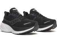 Experience smooth support that feels like floating in the Saucony Hurricane 25. Built for runners who want the perfect balance of cushioning and stability, the Hurricane 25 creates a supportive cradle for your feet without sacrificing the plush comfort you crave. Saucony's innovative dual-density midsole combines their durable PWRRUN foam with ultra-responsive PWRRUN PB cushioning, while Center Path Technology guides every step with confidence. In our Saucony Hurricane 25 review, run tester Kate said "The Hurricane balances support and softness while keeping me in a natural rhythm. Running in them feels both cushioned and fluid. That's a tough combination to get right." Details: - Upper: Soft, stretchy engineered mesh features strategic perforations for excellent breathability. The padded heel collar and tongue keep you secure, while a convenient pull-tab makes slip-on easy. Luxurious tubular laces add a premium touch to every run. - Midsole: The "maxed-out" platform creates a wide, stable base where your feet sit inside the cushioning rather than on top of it. PWRRUN foam frames the midsole for durability, while PWRRUN PB cushioning directly underfoot delivers responsive comfort with every step. - Outsole: Center Path Technology features high sidewalls, asymmetrical reinforcement on the medial side, and a rocker shape with beveled heel that guides you smoothly from landing to toe-off.