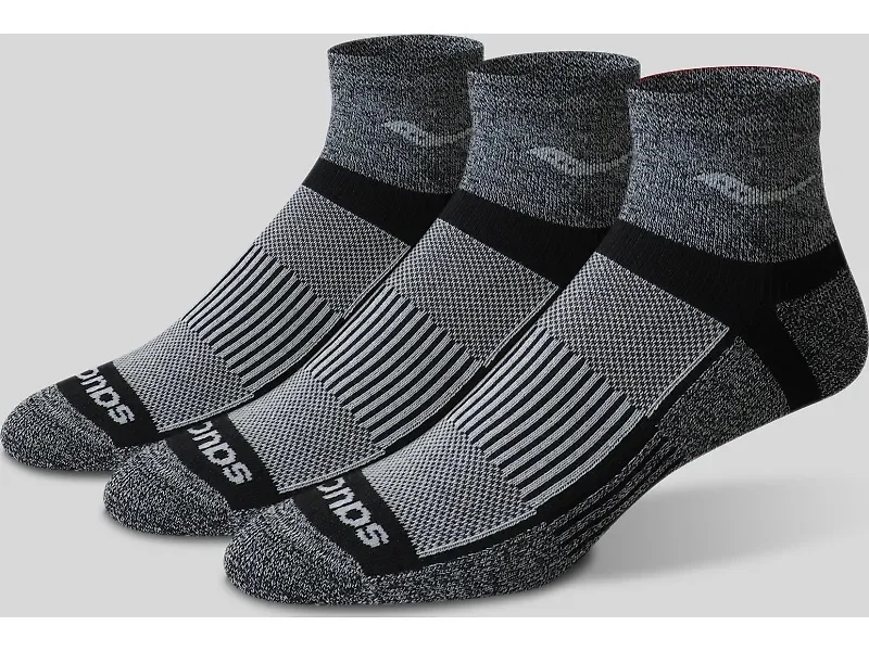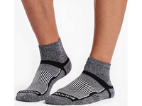 The Saucony Inferno Cushioned Quarter sock is best in class with RunDry® Pro moisture control, a seamless construction and engineered arch and heel lock stability to provide superior performance, fit and comfort whether you're running a race or errands. Details: - Cushioned, everyday performance wear - Engineered heel lock and compression arch support technology for the perfect fit - RunDry® Pro-moisture management to keep your feet fresh and dry - Airmesh venting for maximum airflow - Seamless toe to prevent irritation - Made with Repreve®; a sustainable fiber made from recycled plastic bottles. Each pack is made with up to 2 recycled plastic bottles - Best For: Active all day to race day - Fiber Content: 51% Polyester, 33% Repreve Polyester, 9% Sorbtek, 3% Nylon, 4% Spandex