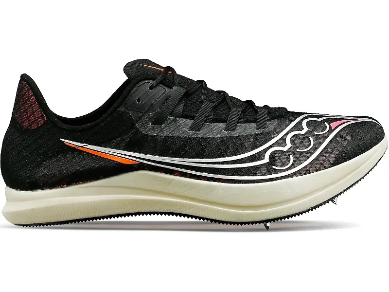 The women's Saucony Terminal VT track spikes will have you locked in and ready to fly on race day. Whether you're a middle-distance or distance runner, these track spikes are designed to make you feel weightless and adapt to your speed over the course of your race—perfect for pacing long-distance events. Featuring an ultra-lightweight upper and springy PWRRUN HG foam midsole, the Terminal VT delivers energetic cushioning and support for every stride. The four-pin Pebax spike plate offers traction and structure while keeping weight to a minimum, so you can fly past the competition. Plus, with its vegan construction and use of recycled materials, you can feel good about your impact on the environment too. Get ready for takeoff in the featherlight Saucony Terminal VT spikes.