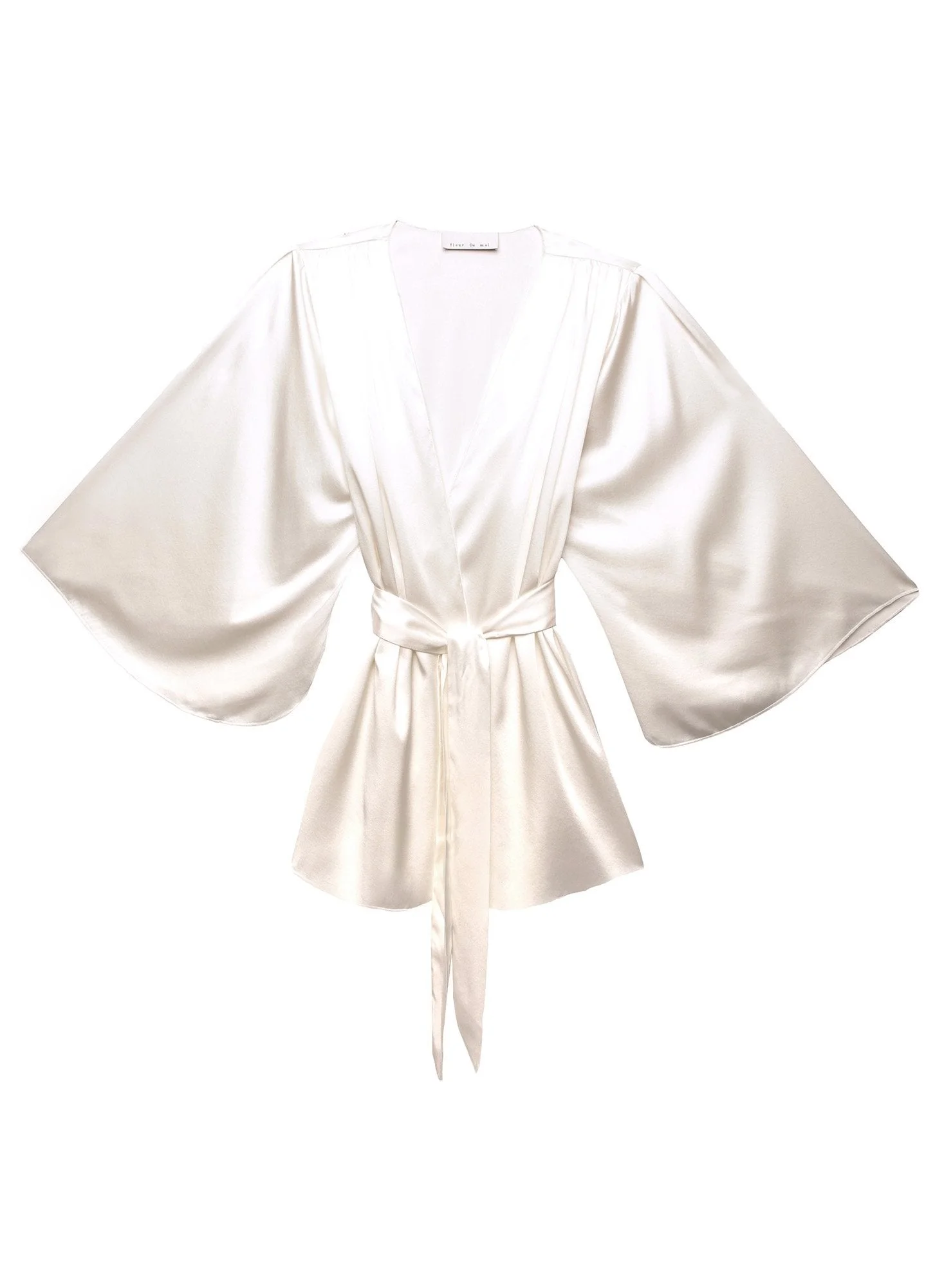 Our best selling Angel Sleeve Robe in luxe 19mm silk charmeuse. Features a playful fit with wide sleeves. Wraps across the body and is secured by a sash. Pair with the Lily Embroidery Plunge Demi Bra and Thong for an immaculate set. Materials & Care - Body: 92% Silk & 8% Spandex - - Dry clean only. - - SKU: RB0098-0300S Size & Fit - Model is 5'10 and wearing a size S/M.