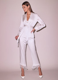 The Bianca Fringe Silk Pant, cut from luxe silk charmeuse with hand-beaded swinging fringe embellishment. Features flat elastic waistband with ruched back for comfort and fit. Easy, relaxed fit. Pair with the matching Bianca Smoking Jacket. Materials & Care - Body: 100% Silk - Lining: 100% Silk - Dry clean only - SKU: PA0186-0300 Size & Fit - Model is 5'11 and wearing a size Small.