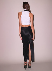 A dish best served hot. Our sleeveless cotton Bib Top features a removable silk necktie. Button up front with pleats along the sides. Back band detail features dual button closures for a figure flattering fit. Get down to business by pairing it with the Silk Maxi Skirt. Materials & Care - Body: 100% Cotton - Necktie: 100% Silk - Dry clean only. - SKU: TP0269-1400 Size & Fit - Model is 5'11 and is wearing a size small.