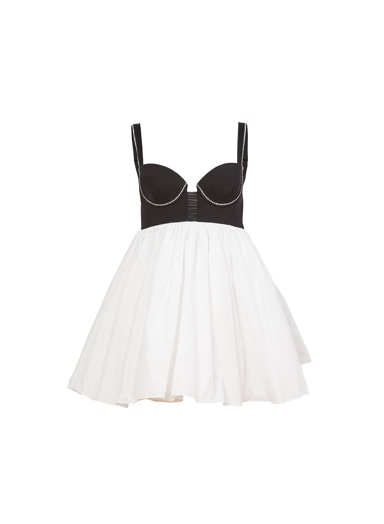 Details, baby. Our ultra flirty Bustier Babydoll Dress, featuring flattering bustier style top with mesh paneling and stunning crystal rhinestone trim. Contrasting Italian taffeta bubble skirt in a sexy mini length. Invisible back zipper closure with fully adjustable straps. Layer over your favorite Essentials panty and be the life of every party. Materials & Care - Body: 54% Cotton, 43% Polyamide & 3% Elastane - Combo: 100% Polyester - Combo 2: 100% Silk - Lining: 85% Polyamide & 15% Elastane - Dry clean only - SKU: DR0437-0300 Size & Fit - Model is 5'9 and wearing a size 2.