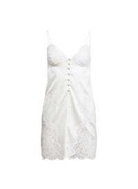 The Cleo Silk Mini Slip, cut from luxe silk charmeuse with French lace applique at front. Fully adjustable silk straps with pearl button detail. Pair with the Cleo Lace Long Robe. Materials & Care - Body: 92% Silk & 8% Elastane - Combo: 70% Organic Cotton & 30% Polyamide - Dry clean only - SKU: SL0140-0300 Size & Fit - Model is 5'11 and wearing a size Small.