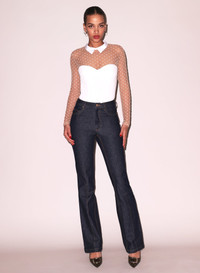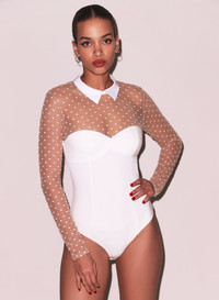 Our Collared Bodysuit with Dotted Tulle is a sophisticated look with edge. Features sheer stretch neckline and sleeves with embroidered dots and collar detail. Seamed bodice is made from stretch Ponti jersey that shows your curves and holds you in. Back zipper and bottom snap closure. Take it out with the Rider Jeans. Materials & Care - Body: 70% Viscose, 25% Polyamide, & 5% Polyamide - Dry clean only. - SKU: BS0033-0300 Size & Fit - Model is wearing a size Small.