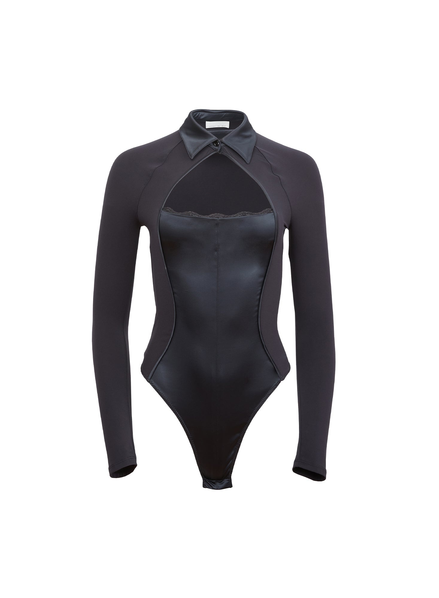Our Decollete Bodysuit, cut from Italian stretch jersey with a luxe satin bodice and lace trim detail. Features a flattering open neck and button up collar. Bottom snap closure, thong cut back. Go from happy hour to after hours with the Tux Short and Sheer Tights. Materials & Care - Self: 87% Recycled Polyester & 13% Elastane - Combo 1: 74% Polyamide & 26% Elastane - Lace: 81% Nylon & 19% Spandex - Dry clean only - SKU: BS0449-0100 Size & Fit - Model is wearing a size Small.