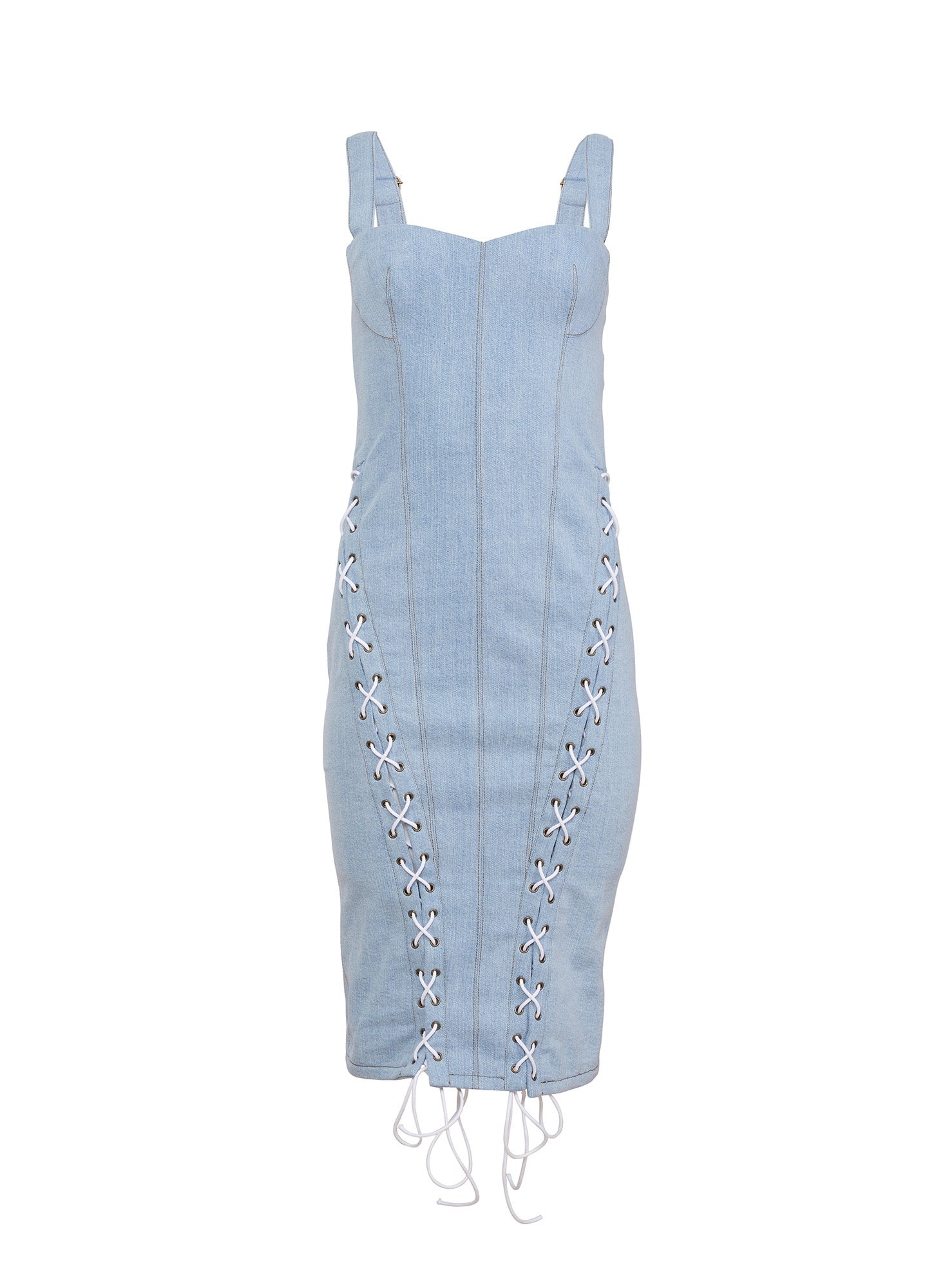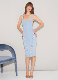 Buckle up, baby. Our chic Denim Lace Up Dress, featuring body-hugging washed denim with lace up detailing. Sexy open back with fully adjustable straps. Midi length. Layer over the Charlotte Lace No Show V Sring for a seamless look. Materials & Care - 92% Cotton, 7% Polyester & 1% Spandex - Machine wash cold with like colors, tumble dry low - SKU: DR0449-0792 Size & Fit - Model is 5'9 and wearing a size 4.