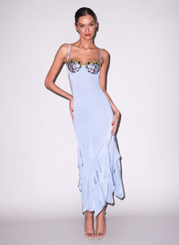 Our Eden Gown, featuring underwire cups with custom floral embroidery and scalloped edge. Maxi length with bottom godets to add drama. Adjustable shoulder straps, back invisible zip closure. Pair with your favorite Essentials panty and heels for a dreamy party look. Materials & Care - Body: 100% Silk - Combo: 100% Polyester - Dry clean only - SKU: DR0662-1008 Size & Fit - Model is 5'11 and wearing a size 4.