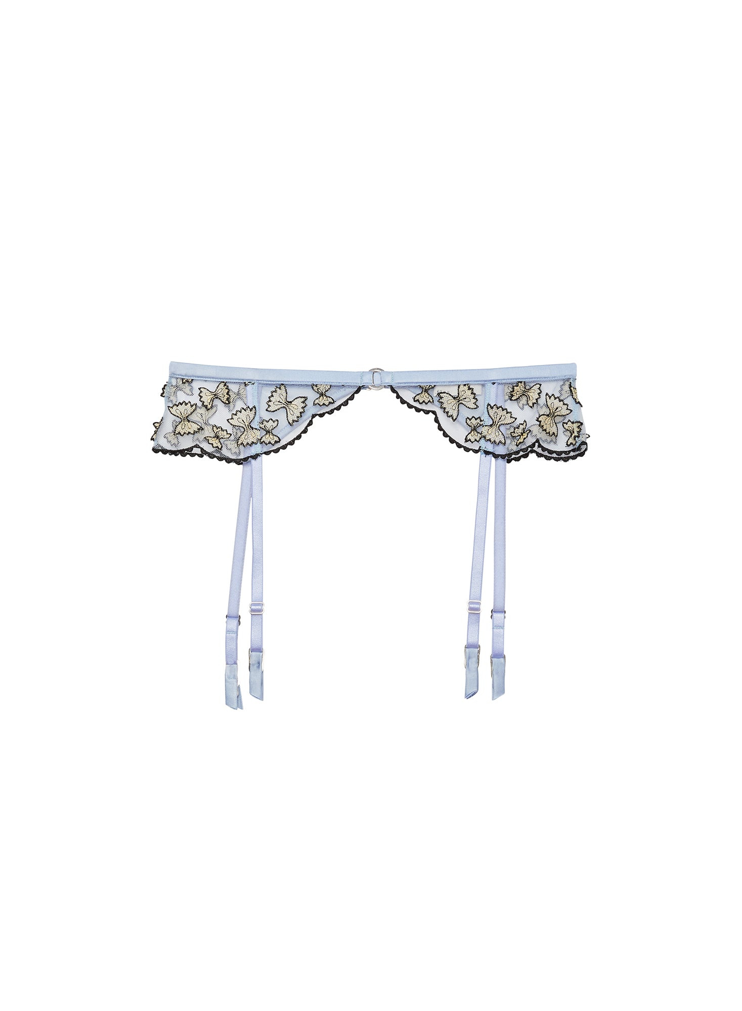 Dinner date. Our Farfalle Embroidery Garter Belt, featuring 3D farfalle pasta embroidery on sheer tulle. Silk covered adjustable straps and elastic waistband with center back closure. Complete the set with the matching Farfalle Embroidery Balconette and Thong. Materials & Care - Lace: 100% Polyamide - Combo 1: 92% Silk & 8% Elastane - Combo 2: 85% Polyamide % 15% Elastane - Hand wash cold separately, lay flat to dry. Do not soak. - SKU: GR0080-0612-001 Size & Fit - Model is wearing a size 2, the equivalent to size Small.