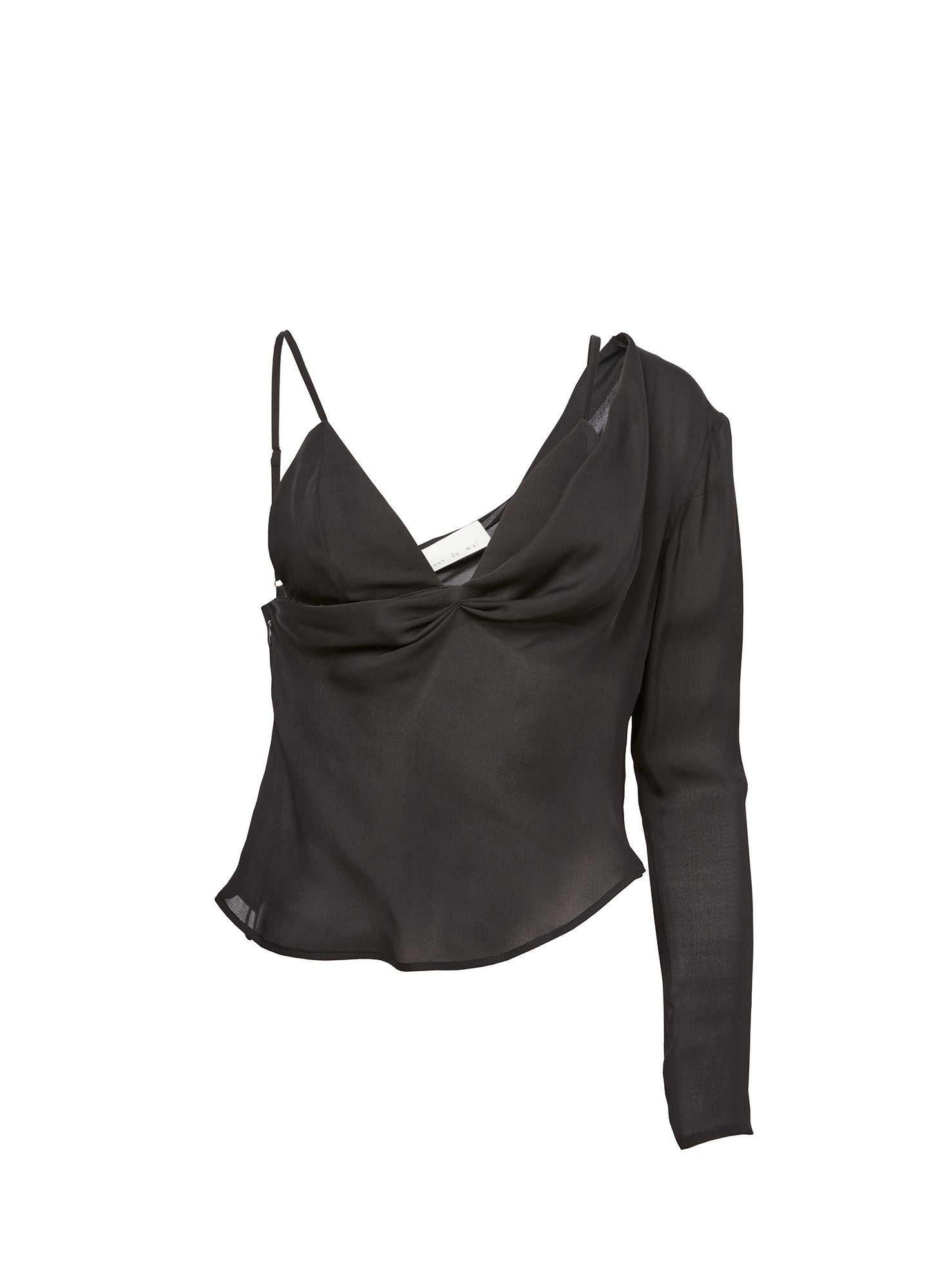 Double duty. Inspired by our signature Luxe Triangle Bra, our Georgette Triangle Top is a bra and top all in one. Silk georgette asymmetrical top with hidden silk charmeuse triangle bra. Invisible side zipper closure, curved hem. Looks chic with the Silk & Chantilly Lace Midi Skirt. Materials & Care - Body: 100% Silk - Lining: 100% Polyester - Combo: 92% Silk & 8% Elastane - Dry clean - SKU: TP0538-0100 Size & Fit - Model is 5'9 and is wearing a size S.