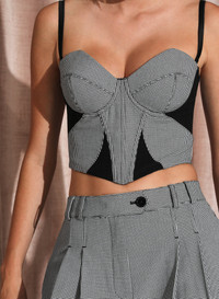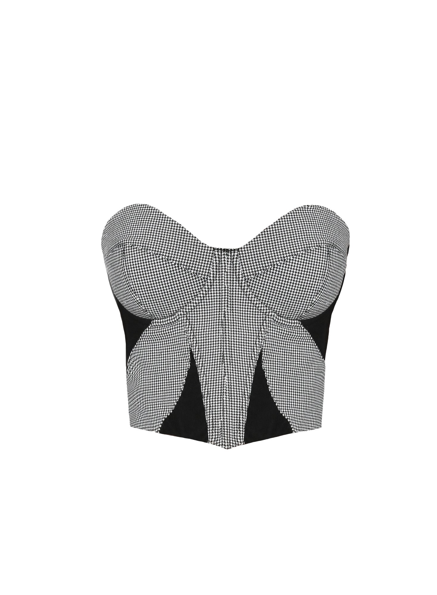 Checking you out. Our Houndstooth Bustier, featuring playful mini houndstooth print with mesh panel details. Ultra flattering underwire cups are lined in light foam and silk for added support and coverage. Sexy exposed back zipper detail and removable adjustable straps. Suit up with the matching Relaxed Houndstooth Pant. Materials & Care - Body: 57% Polyester, 33% Rayon, 7% Acrylic, 3% Polyurethane - Combo: 78% Nylon, 22% Spandex - Combo 2: 92% Silk, 8% Elastane - Hand wash cold with similar colors, lay flat to dry - SKU: TP0562-0845 Size & Fit - Model is wearing a size Small.
