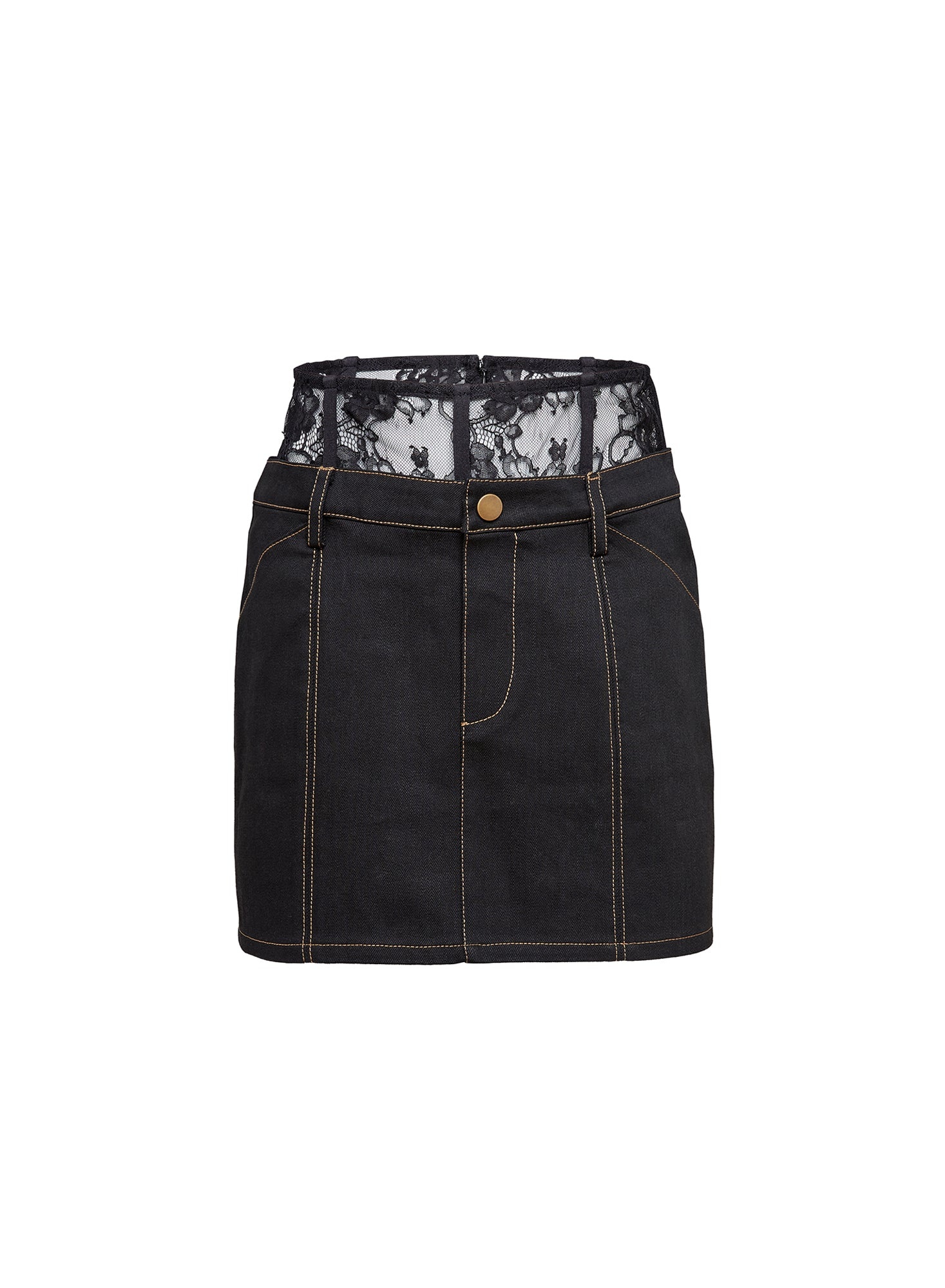 Turn heads in our Lace Waistband Skirt. Black denim mini skirt featuring attached lace waistband with soft boning detail and exposed back zipper detail. Pull on style. Take it out with the Silk & Lace Bandeau Top. Materials & Care - Body: 99% Cotton & 1% Spandex - Combo: Nylon, Cotton, Tencel - Dry clean only - SKU: SK0175-0100 Size & Fit - Model is 5'11 and wearing a size 2.