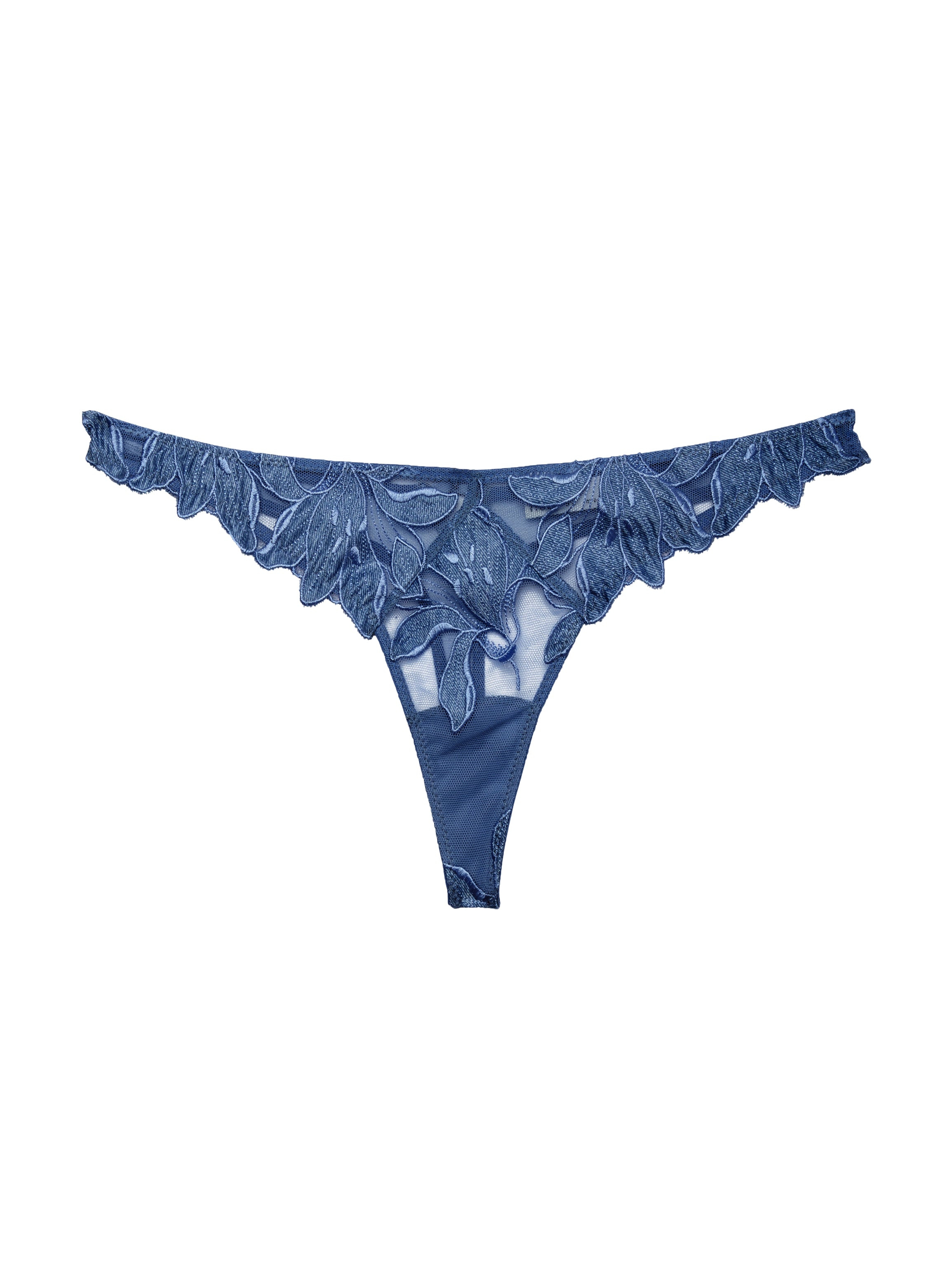 Our Lily Embroidery Hipster Thong. Features denim printed silk on tulle, floral embroidered lilies with flirty scalloped edges, and mesh back. Pair it back to the matching Lily Embroidery Plunge Demi Bra and Garter. Materials & Care - Body: 100% PES - Combo 1: 85% Polyamide & 15% Elastane - Combo 2: 92% Silk & 8% Elastane - Gusset Lining: 100% Cotton - Hand wash cold, hang or lay flat to dry. Do not soak. - SKU: PY0202-0826-001 Size & Fit - Model is wearing a size 2, the equivalent to size Small.
