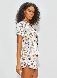 Let's make magic. Decadent silk short sleeve pajama top in our magical mushroom print. Featuring front buttons, contrasting black trim and pocket detail. Pair with the matching Magical Mushroom Pajama Short for a chic set that works perfectly on the streets or in the sheets. Materials & Care - Body: 100% Silk - Dry clean, or hand wash cold and lay flat to dry - SKU: TP0403-0616 Size & Fit - Model is 5'9 and wearing a size small.