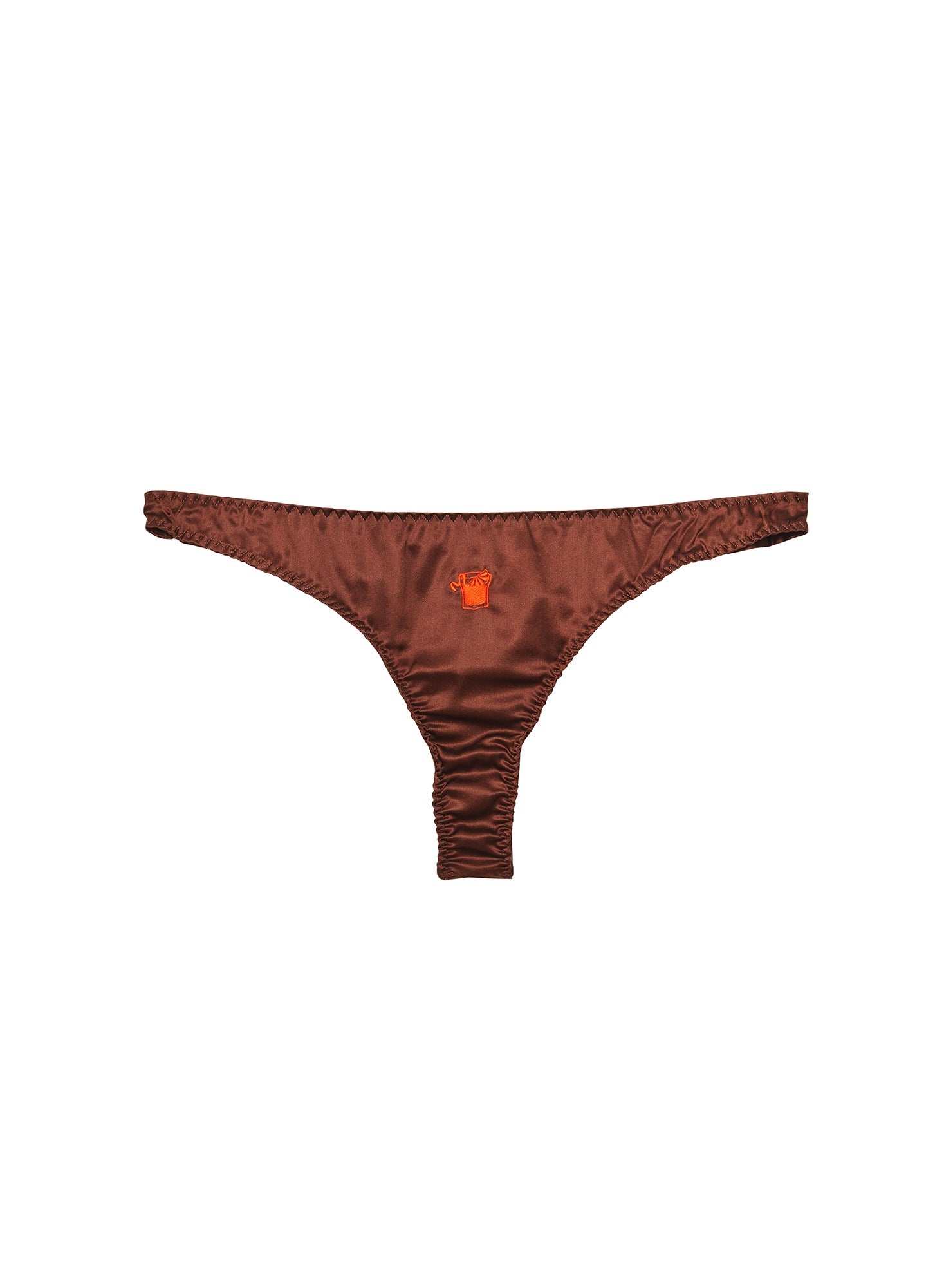 Get tipsy. Our best selling, stretch silk satin Luxe Thong with flirty embroidered Negroni cocktail detail. Barely there feel with playful keyhole at back. Subtle seamed detailing along edges. Quench your thirst with the matching Negroni Embroidered Luxe Triangle Bra. Materials & Care - Body: 98% Silk & 2% Elastane - Gusset: 100% Cotton - Hand wash cold, hang or lay flat to dry. Do not soak. - SKU: PY0431-0637-001 Size & Fit - Model is wearing a size 2, the equivalent to a small.