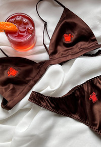 Thirsty? Our best selling, stretch silk satin Luxe Triangle Bra with flirty embroidered Negroni cocktail detail. Features smooth band and silk lined cups, this bralette works perfectly as a luxe everyday bra, or worn by itself as a top under a blazer. Quench your thirst with the matching Negroni Embroidered Luxe Thong. Materials & Care - Body: 92% Silk & 8% Elastane - Hand wash cold, hang or lay flat to dry. Do not soak. - SKU: BR0414-0637 Size & Fit - Model is a 34B and wearing a size Small.