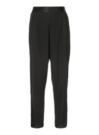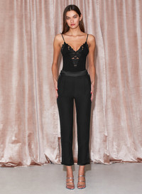 Sexy MF. Our Silk Pleated Tuxedo Pant in black. Side button closure detailing and satin cuffed hems. Pair with the Bouquet Lace Bustier Top. Materials & Care - Body: 100% Silk - Dry clean only - SKU: PA0023R-0100 Size & Fit - Kiana is 5'11 and wearing a size 4. - Sienna is 5'9 and wearing a size 2. - Size 4 pant has a 12" rise, 29 1/4" inseam.