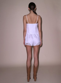 Lightweight European cotton Poplin Cami. Features flirty butterfly hem with handcut lace detail at neckline. Complete the set with the matching Poplin Boxer Short. Materials & Care - Body: 100% Cotton - Combo: 49.1% Polyamide, 28.2% Cotton, & 22.7% Lyocell - Dry clean only - SKU: TP0584-1400 Size & Fit - Model is 5'11 and wearing a size S.