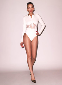 Our Rib & Bouquet Lace Underbust Bodysuit, featuring stretch floral lace bodice Henley-style with invisible back zipper and bottom snap closure. High leg cut. Take it out with the Tuxedo Pant. Materials & Care - Body: 97% Cotton & 3% Spandex - Combo: 79% Nylon & 21% Spandex - Gusset: 100% Cotton - Dry clean or hand wash cold & lay flat to dry. Do not tumble dry. - SKU: BS0459-0910 Size & Fit - Model is 5'11 and wearing a size Small.