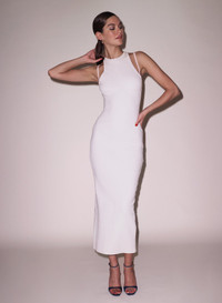 Our Strappy Ribbed Maxi Dress, featuring classic column shape with flattering racer back. Cut from luxe ribbed knit with underbust detail that continues onto shoulder straps. Hits at the ankle. Layer over the Charlotte Spacer Plunge Bra and Seamless Thong. Materials & Care - Body: 97% Cotton & 3% Spandex - Hand wash with similar colors & lay flat to dry. Do not iron or soak. - SKU: DR0531-0910 Size & Fit - Model is 5'11 and wearing a size S.