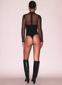 Our Tuxedo Bodysuit, featuring sexy plunge neckline with silk lapels and stretch mesh sleeves. Comfortable Italian stretch recycled jersey body with back zipper and bottom snap closure. Take it out with the Tuxedo Pant. Materials & Care - Body: 74% Polyamide & 26% Elastane - Combo 1: 100% Silk - Combo 2: 90% Nylon & 10% Spandex - Dry clean only - SKU: BS0448-0100 Size & Fit - Model is wearing a size S.