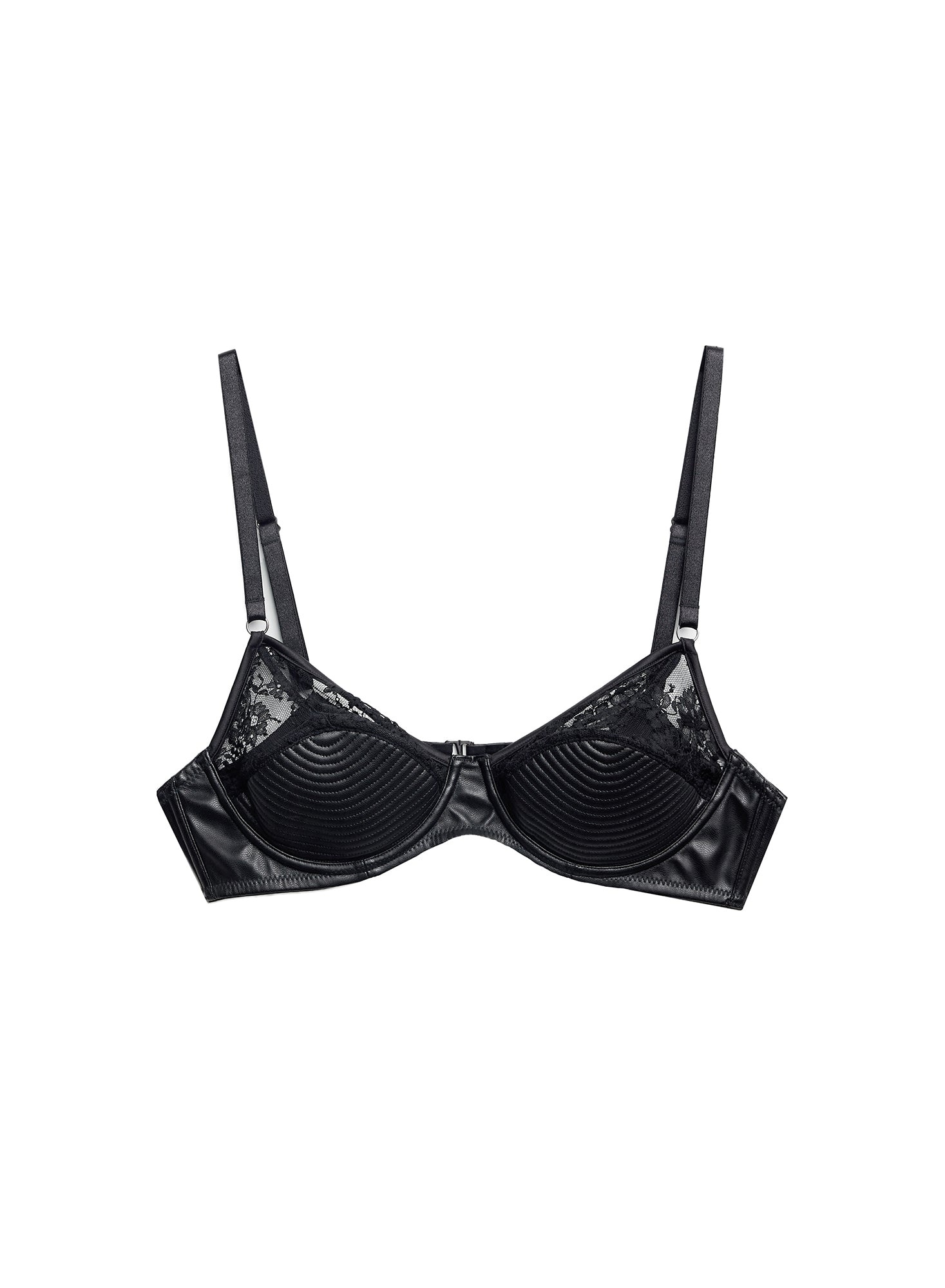 Leather & lace. Our Vegan Leather Bebe Bra features stretch vegan leather cups with top stitch detailing. Stunning French leavers lace on top cup. Fully adjustable straps and back hook and eye closure for a customized fit. Light foam for support. Pair with the matching Vegan Leather Hipster and thigh highs for an unforgettable nighttime look. Materials & Care - 100% PU - Back: 100% Poly - Combo: 92% Silk & 8% Spandex - Spot clean or hand wash gently and lay flat to dry - - SKU: BR0281-0100-32B Size & Fit - Model is wearing a size 34B.